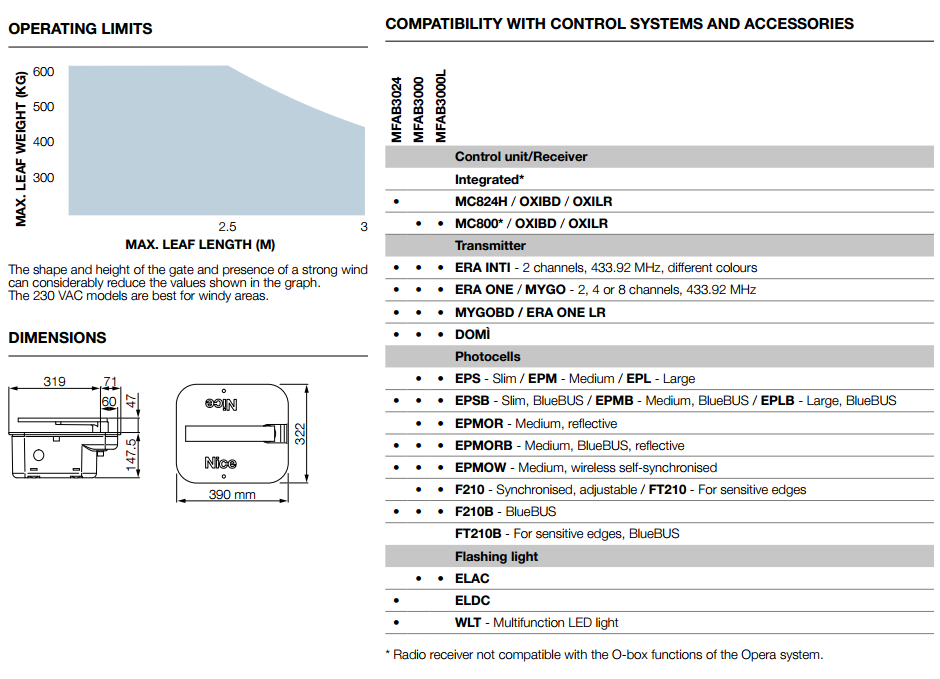 Recommended control units: Moonclever MC800 for MFAB3000 and MFAB3000L; Moonclever MC824H for MFAB3024. 24 VDC version with magnetic encoder. Ideal for intensive use.